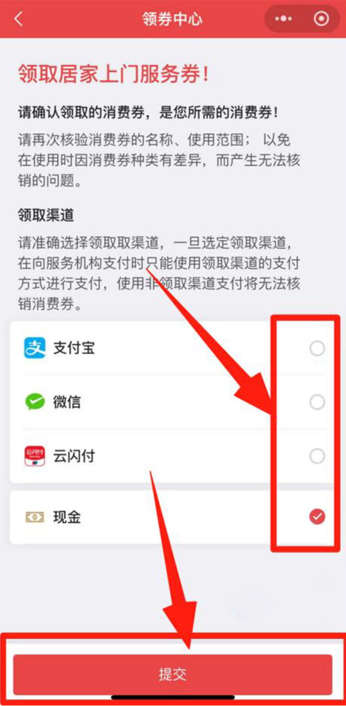 首页点击进入“养老服务消费补贴项目”,选择“消费券领取”,点击“立即领取”,选择自己要申领的消费券点击“领取”,选择“支付宝、微信、云闪付等领取渠道”,最后点击“提交”。